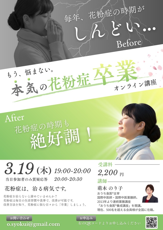 3/19(木)19:00-20:00 花粉症は、治る病気です。 花粉症を治らないと諦めていませんか? 花粉症は毎日の生活習慣や食事で、改善が可能です。 改善方法を知り、花粉症に悩む日々から「卒業」しましょう。 ※こちらはアーカイブ受講となります。当日ご参加される方はそちらの商品をお求めください。